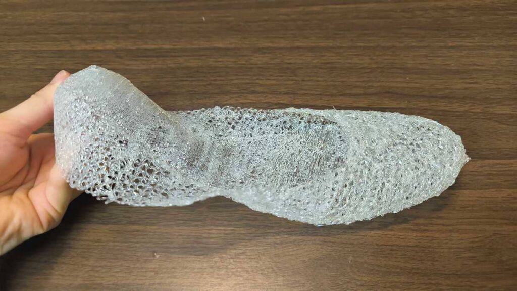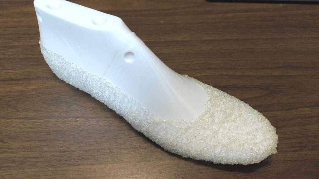 透明TPU素材を使用し、3Dペンでの靴作りに挑戦。地道な作業の末、なんとか靴のような形に仕上がり、改良の余地はあるものの、履けるものが作れる可能性を感じました。