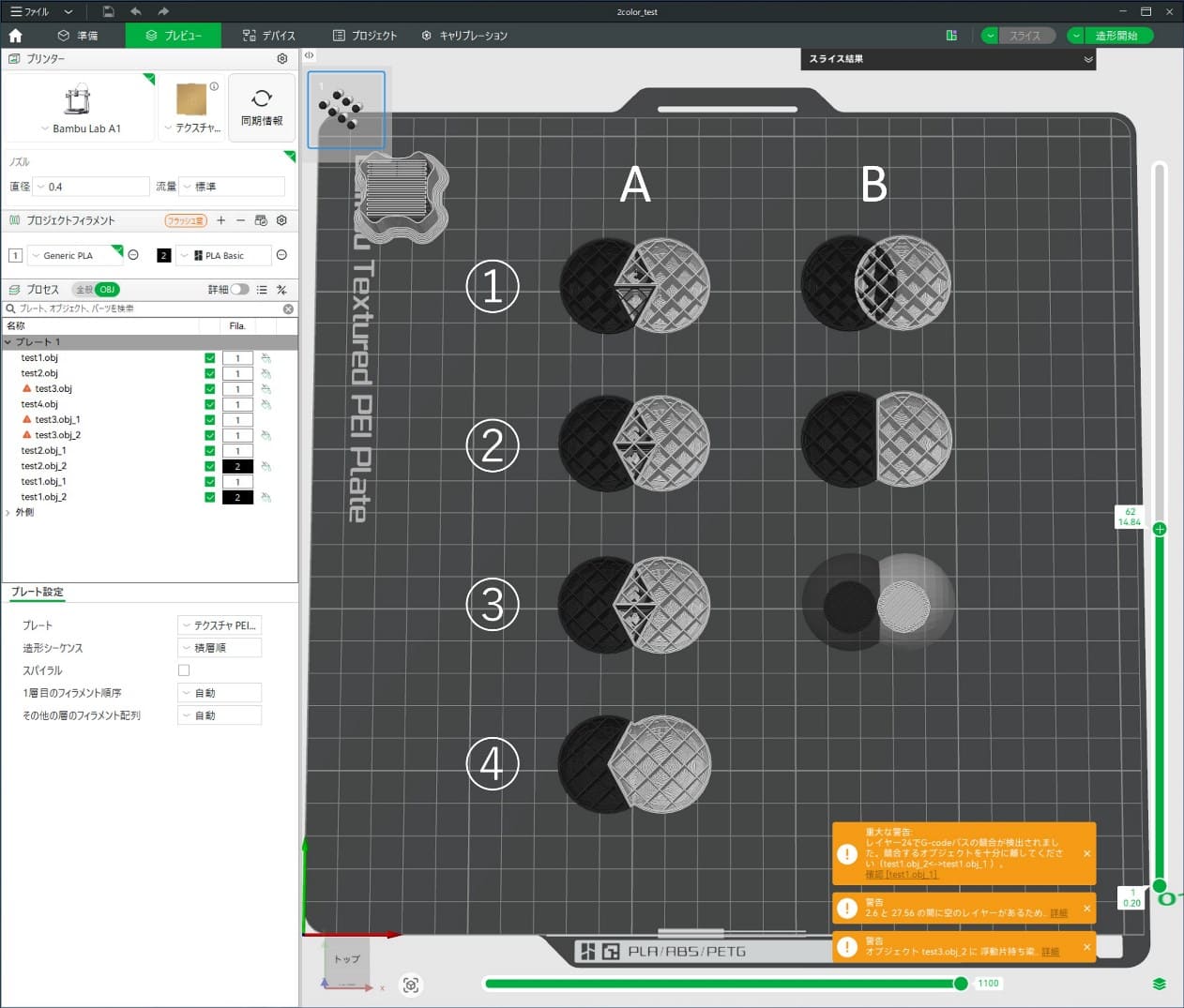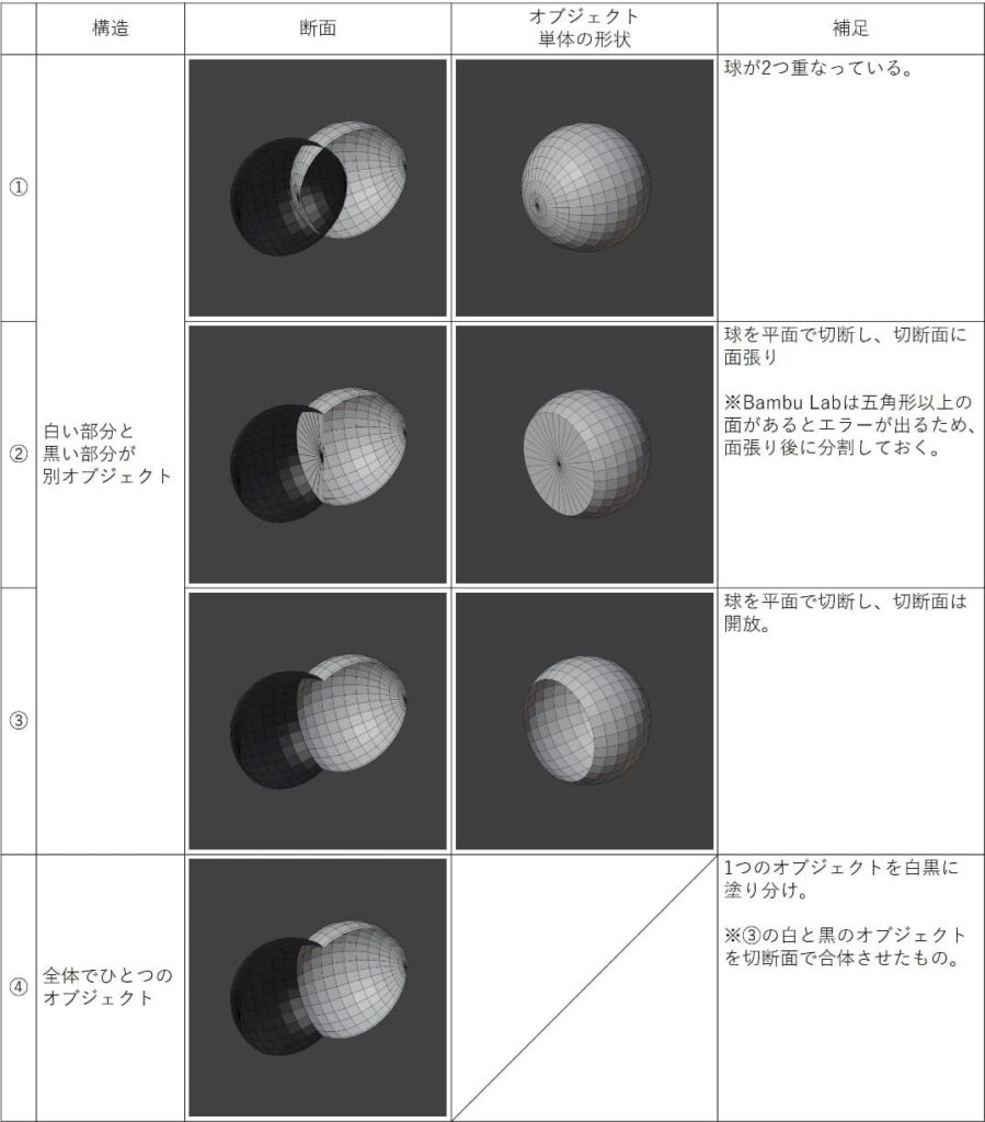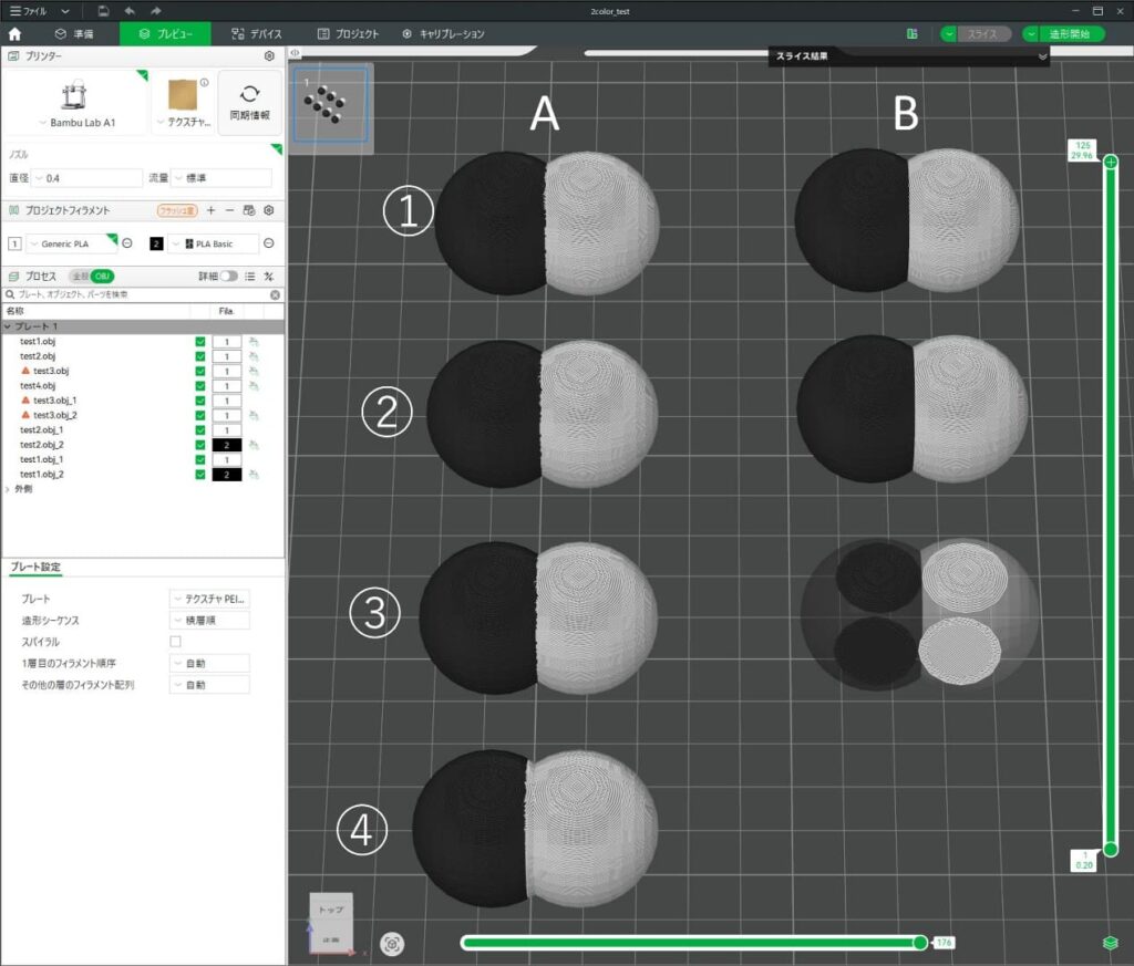 Bambu Labで多色プリントをする場合、3Dモデルの構造と色の設定方法がいくつか考えられます。それぞれの条件がスライスの結果にどのように影響するかをまとめました。