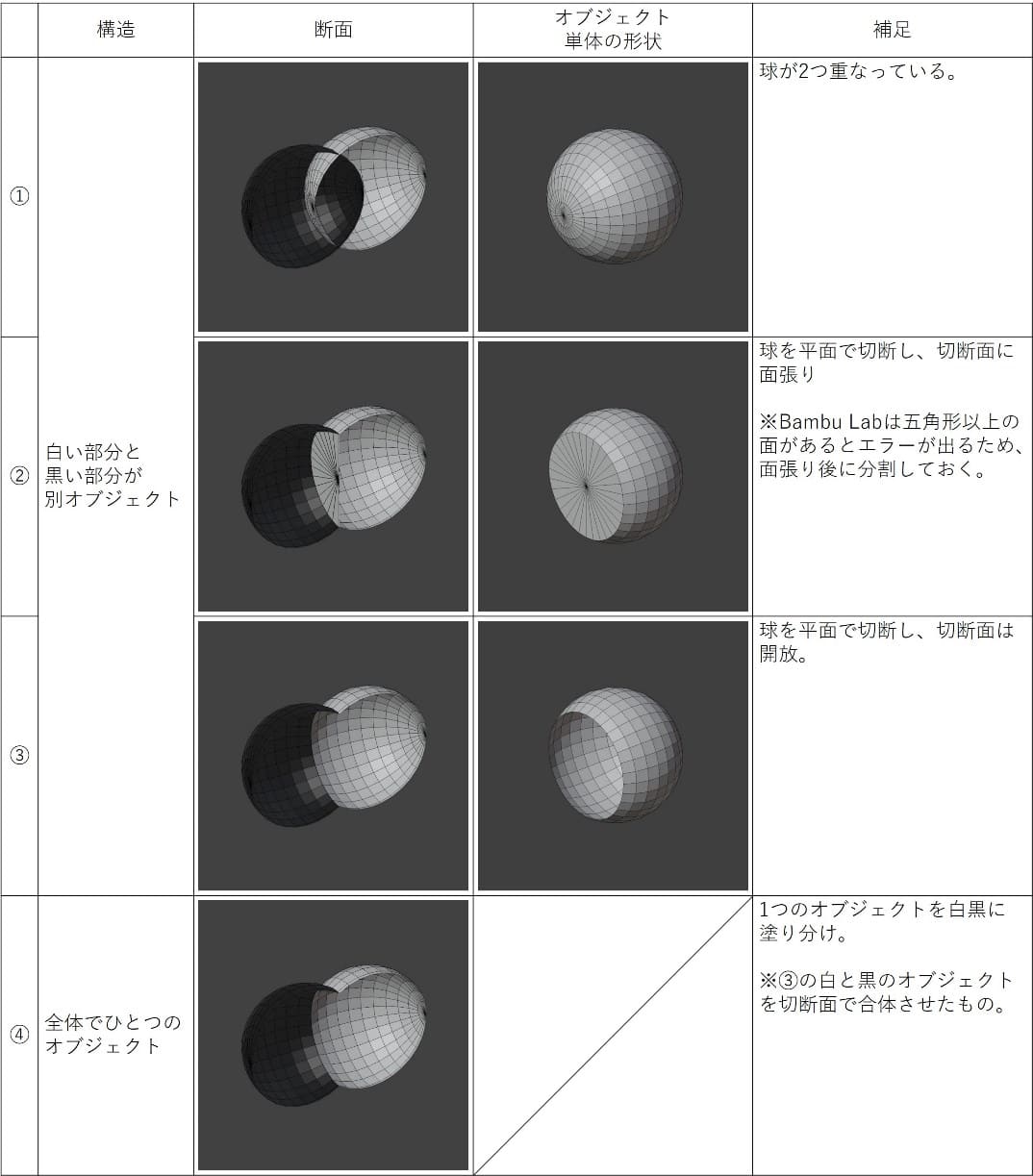 外観が同じに見えても、構造が異なる4種類の3Dモデルが考えられます。