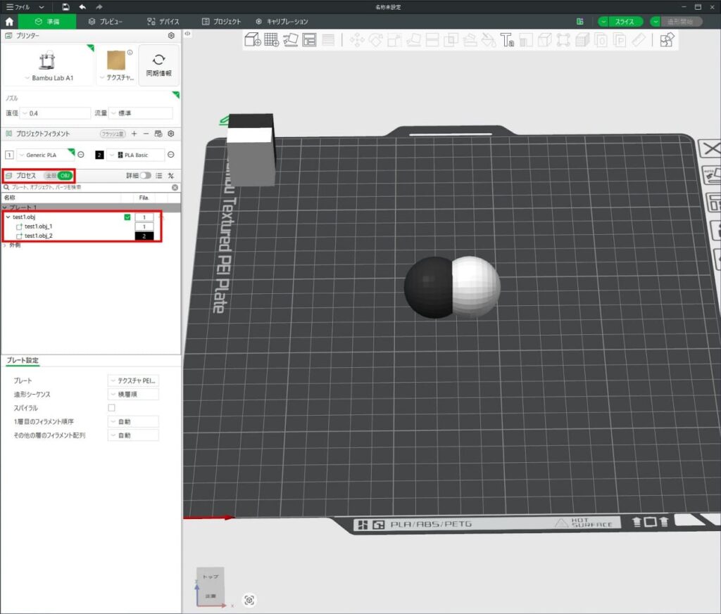 Bambu Studio(スライサー)にobjファイルをインポートし、頂点カラーに応じて色を設定する。