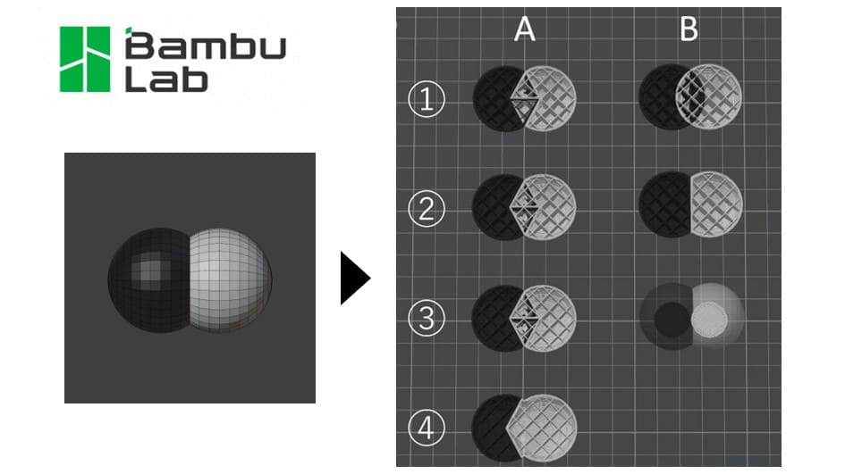 造形物を光にかざすと、内部で白黒が混ざっているのが見える可能性があります。造形物の内部までこだわって色分けしたい場合は、②-Bの条件が良さそうです。