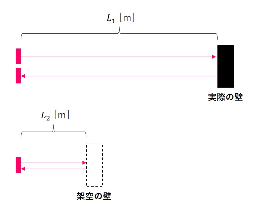 ということで、センサーから「実際の壁」までの距離を L1 [m] とします。検出した「架空の壁」までの距離を L2 [m] とします。この2つの関係を求めてみます。