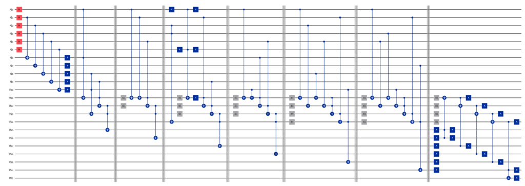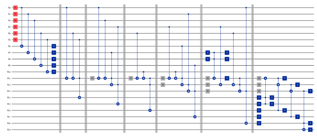 もう一つ工夫してみます。これまでは途中式が出る度に新品の量子ビットを使っていたので36量子ビットまで膨らんでいました(それでも少ないほうですが)。