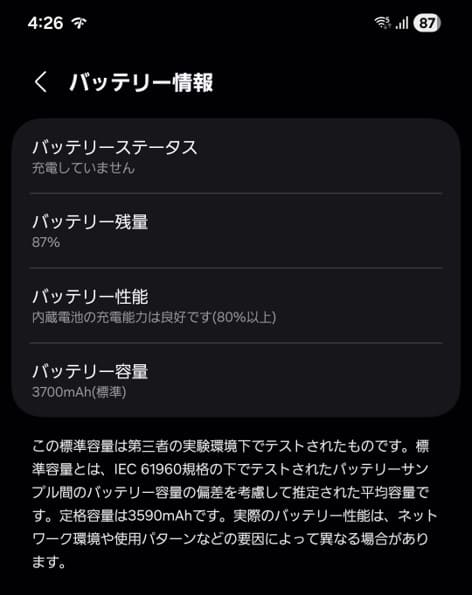 私のスマホ「Galaxy S22」のバッテリーは3700mAhです。