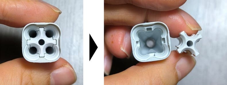 さらにチューブの根元の隙間にもマイナスドライバーを差し込んで外します。ここはちょっと固いです。なかなか外れないので部品を傷つけてしまいました。分解してはいけない場所だったのかもしれません。