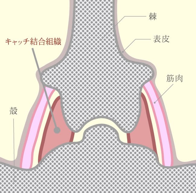 ウニの棘の根元の関節部は、ボールジョイント状になっています。 360度、どの方向にも倒すことができ、関節をとりまく二層の組織(筋肉とキャッチ結合組織)がトゲと殻(カラ)をつないでいます。