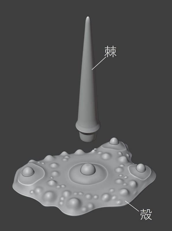 棘と殻の3Dモデルを作成し、磁石を埋め込めるように内部に空洞を設けました。