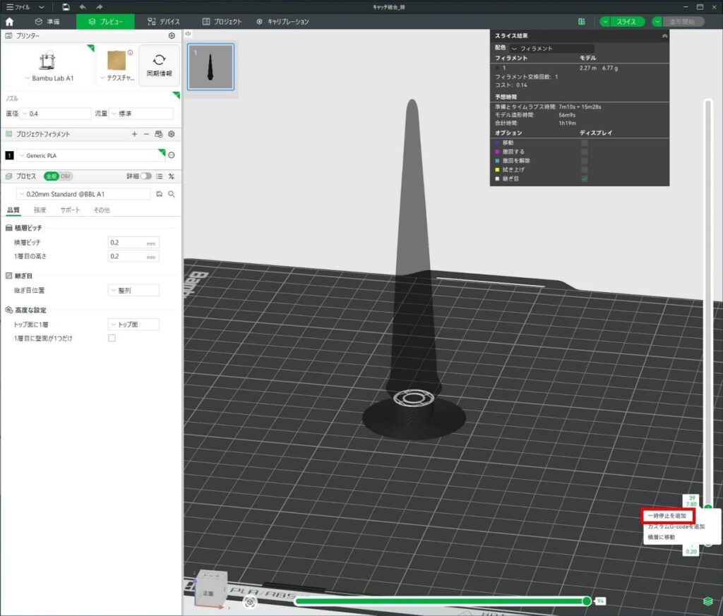 棘の3Dプリントでは、途中までプリントして一時停止し、磁石を設置してからプリントを再開する方法で磁石を埋め込みました。Bambu Lab Studioでは、一度スライスした後、レイヤーを選択して「一時停止を追加」することで簡単に一時停止の設定が可能です。