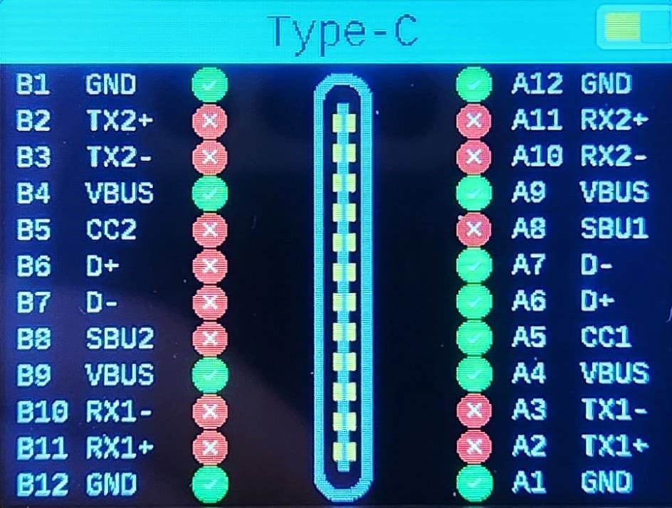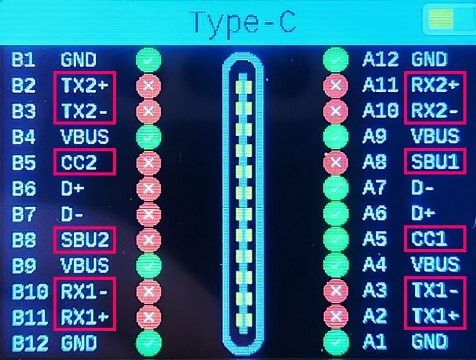 こんな感じのケーブルチェッカーでピンやeMarkerの対応を確認できるので、どのピンが有効だとどの規格になるのか、しっかり勉強しておきましょう。この記事で扱うのは両端がタイプCのケーブルです。